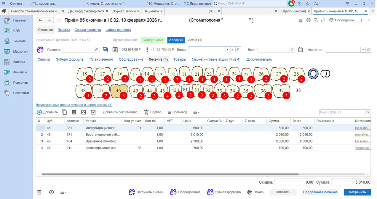 • Учет комплексных планов лечения, предполагающих серию посещений клиники.