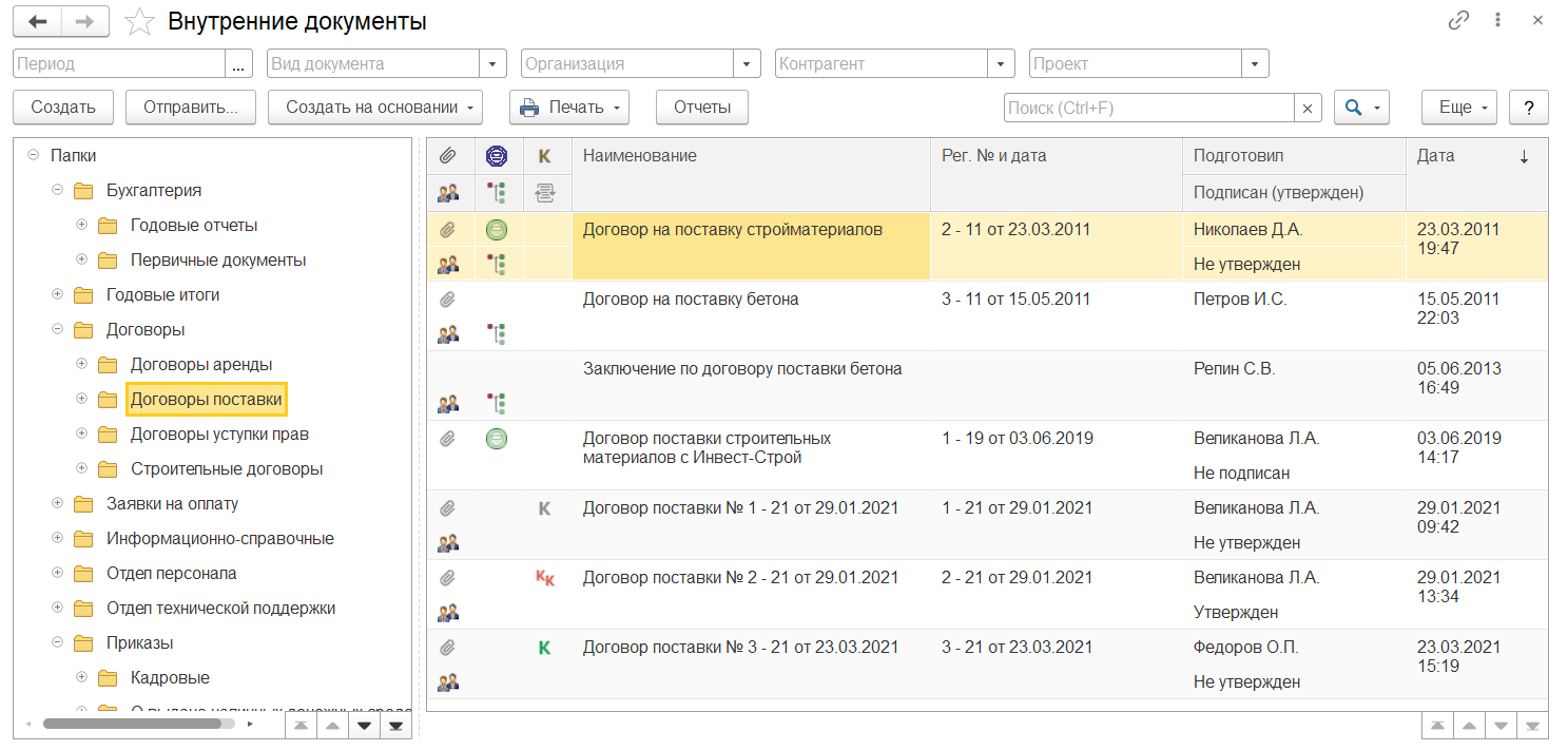 Используйте «1С: Документооборот» для простого создания и ведения входящих, исходящих и внутренних документов, сопроводительной или сопутствующей документации, используя шаблоны и связи документов. Контролируйте исполнение обязательств по документу, наличие сопроводительных документов. Ведите договорной учет.
