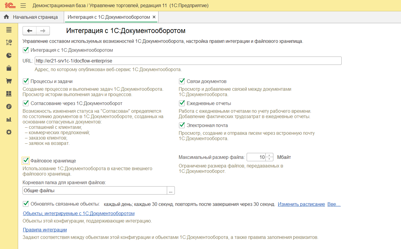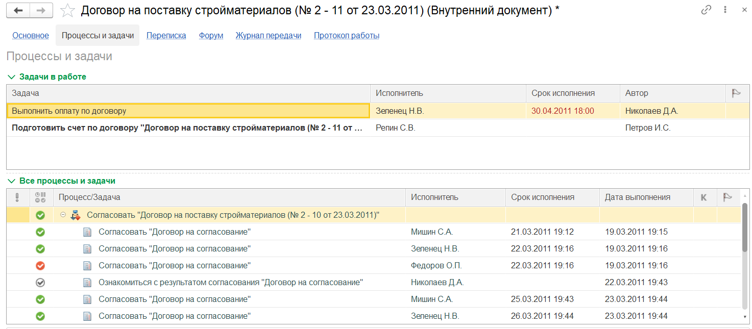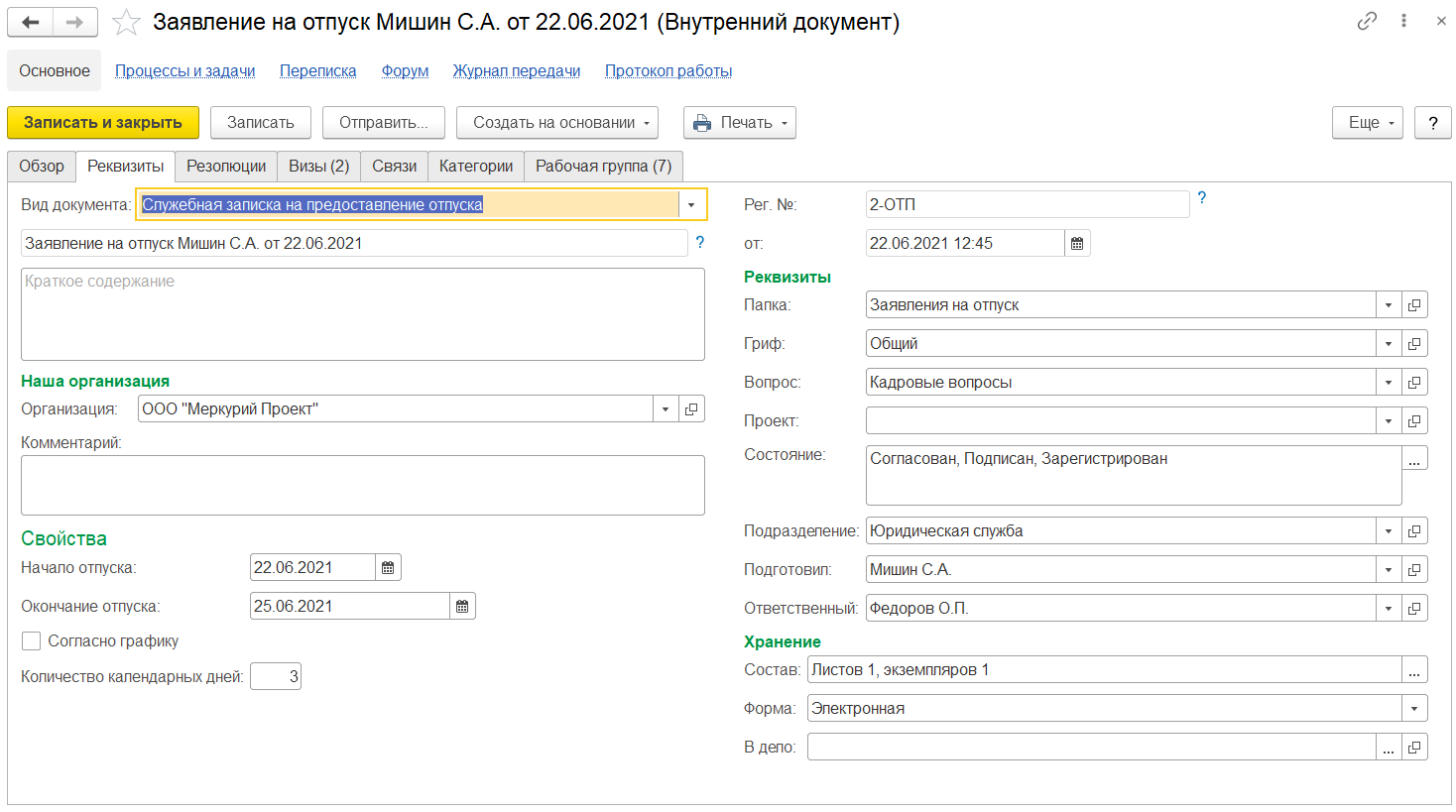 Когда основные настройки завершены проводим тестирование процессов в 1С:Документооборот. Для