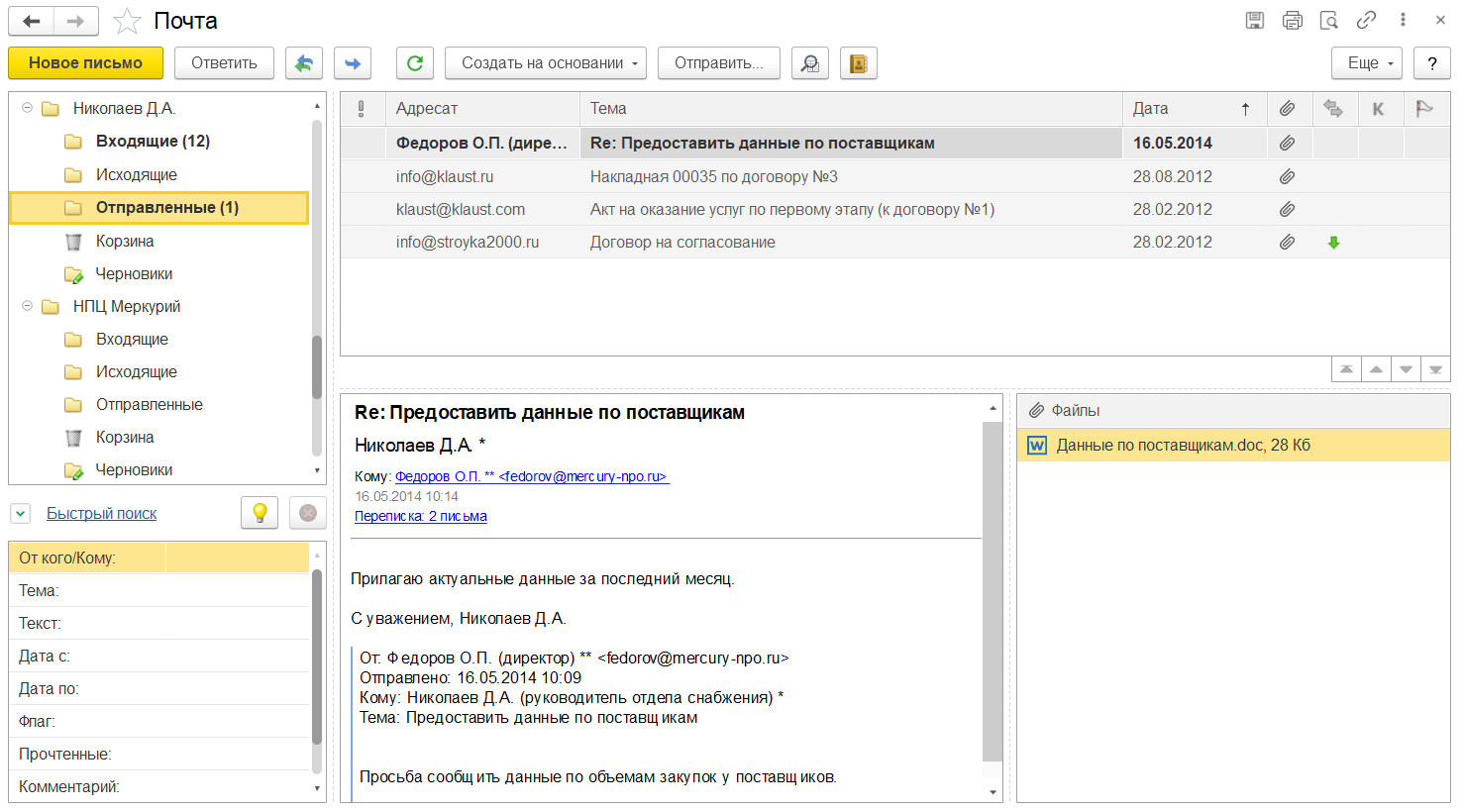 Работайте с электронной почтой прямо в системе, не переключаясь в другие программы и интерфейсы, при необходимости используйте несколько почтовых ящиков. Ставьте задачи и поручения из электронной почты, включать переписку в информацию по документу, прикрепляйте письма к задачам. Отправляйте документы из системы в один клик.