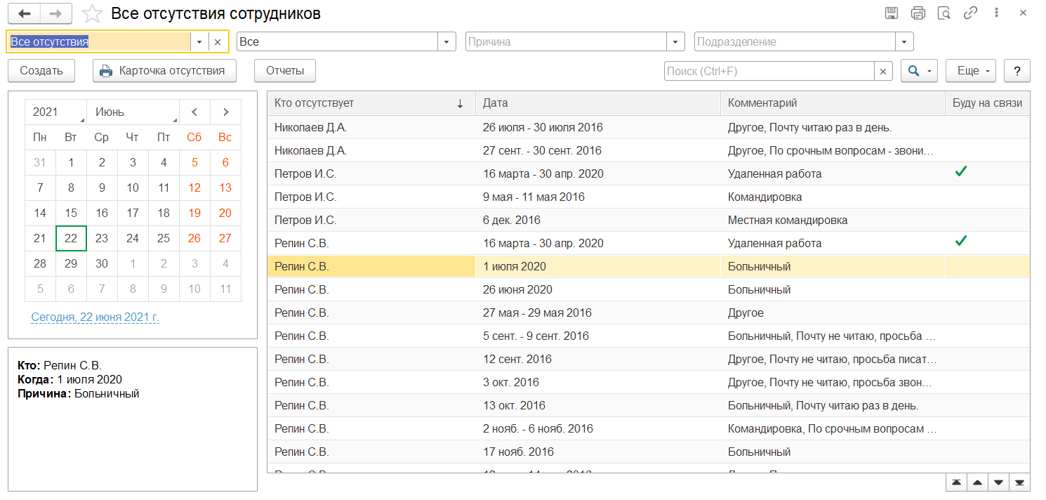Ведите учет рабочего времени и отсутствий сотрудников.