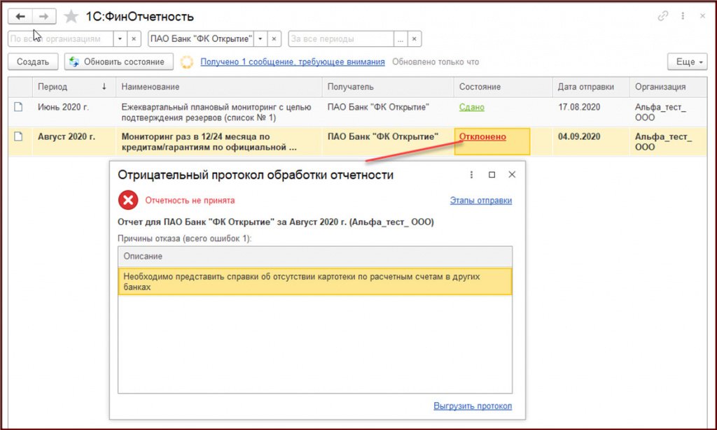 После получения пакета отчетности банк направляет уведомление о получении от организации, и состояние изменяется на "Доставлено". По результатам анализа отчетности банком пользователю приходит протокол. При отсутствии вопросов значение изменяется на "Сдано". Посмотреть можно по соответствующей гиперссылке. Если есть замечания - состояние изменяется на значение "Отклонено".