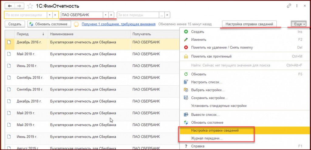 Для Сбербанка работа с отчетностью в основном не изменилась. При выборе ПАО Сбербанк получателю в форме списка 1С:ФинОтчетность становятся доступны специальные команды: