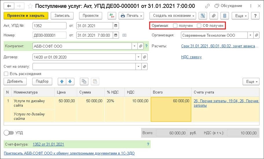 Когда пользователь получает оригинал первичного учетного документа, он ставит флажок «получен», а если поступил счет-фактура, то ставит флажок «СФ получен». Если поступил УПД, то флажок ставится только в графе «получен».
