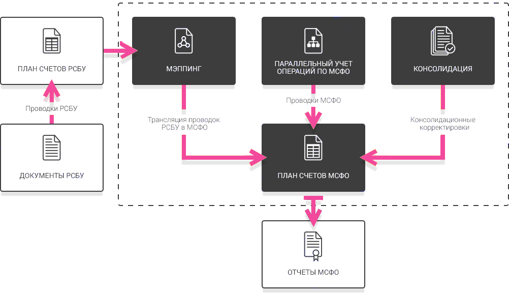 Для операций, где учетные принципы РСБУ и МСФО совпадают или близки, используется автоматическая трансляция. Для участков, где различия существенны, используются специализированные документы международного учета. К таким участкам относятся, в частности, основные средства, нематериальные активы, аренда, запасы, финансовые инструменты и отложенные налоги.