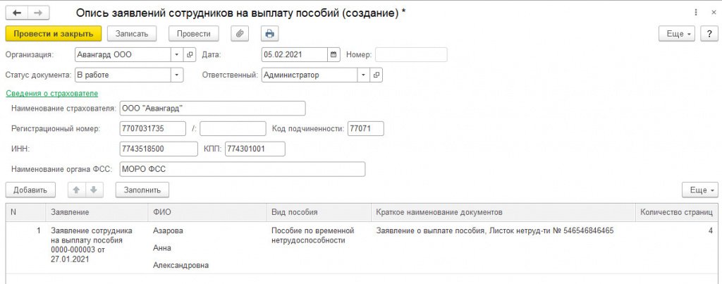 Заполненное заявление можно распечатать после проведения документа для подписи сотрудником. Передача реестра на выплату пособий возможна после внесения информации по ссылке на закладке «Пилотный проект».
