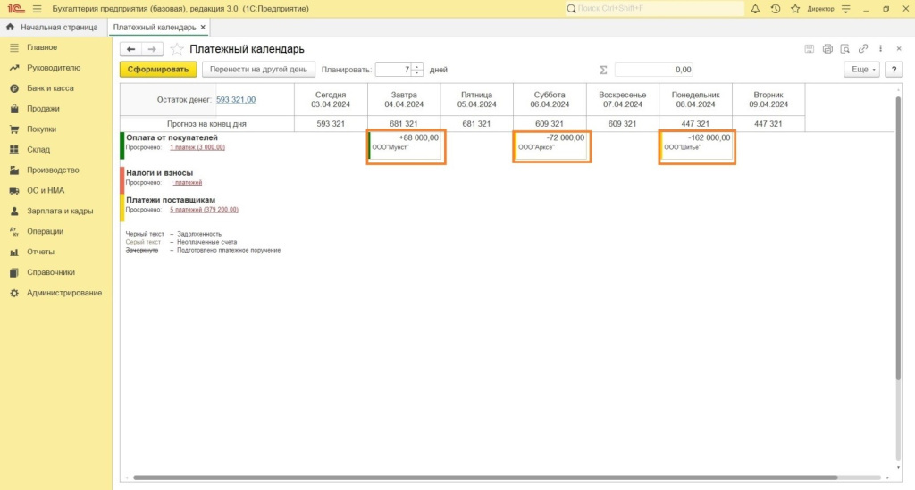 В приведенном примере: 04.04.2024 должны прийти 88000 рублей от ООО «Мунст», 06.04.2024 мы заплатим ООО «Арксе» 72000 рублей, а 08.04.24 ООО «Шитье» 162000 рублей.