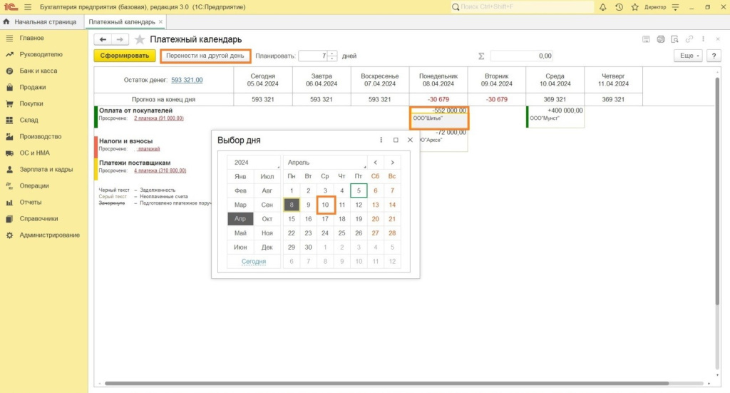 В платежном календаре можно убрать кассовый разрыв, сдвинув срок оплаты с помощью кнопки Перенести на другой день. В прилагаемом примере 08.04.2024 намечается кассовый разрыв.