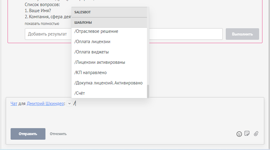 Для того, чтобы использовать шаблон вам нужно написать в поле ввода сообщений символ “/” или ввести название шаблона. После чего в выпадающем меню выбрать соответствующий вариант. Шаблоны можно добавлять в “Избранное”.