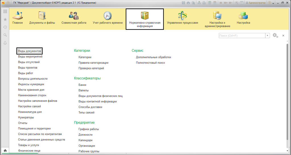 Для создания шаблона, нужно создать новый вид документа. Он будет заполнять наш шаблон. Для этого открываем раздел "Нормативно-справочная информация"-"Виды документов".
