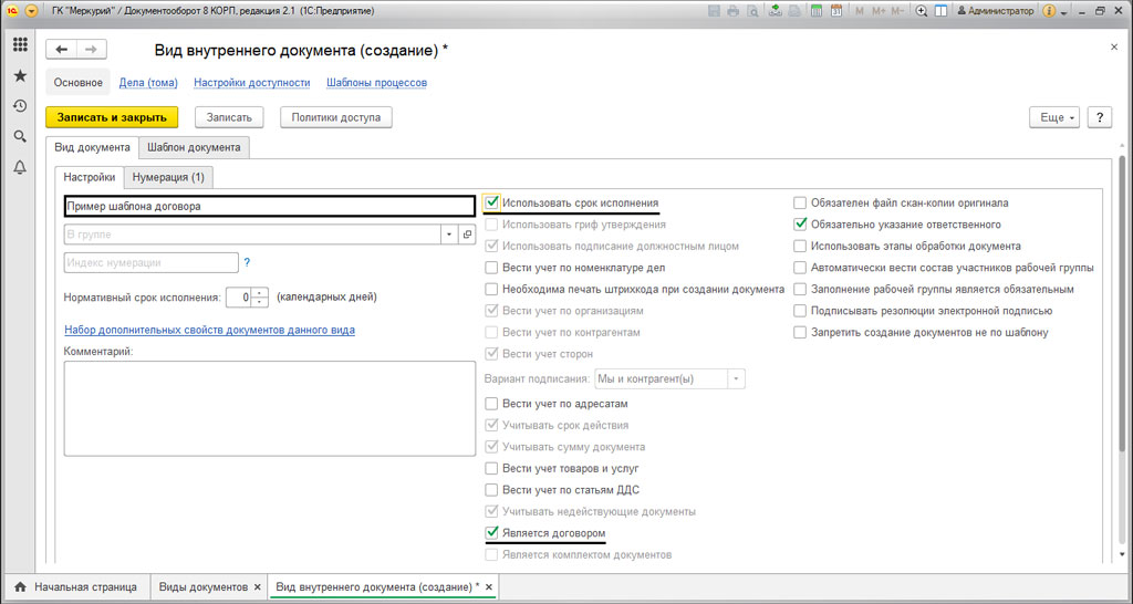 Называем его, например, "Пример шаблона договора" и в настройках ставим галочки на "Использовать срок исполнения ", после на "Является договором". Если необходимо включить документ в нужную группу, то вам потребуется задать индекс нумератора. Так называемый суффикс либо префикс документа.