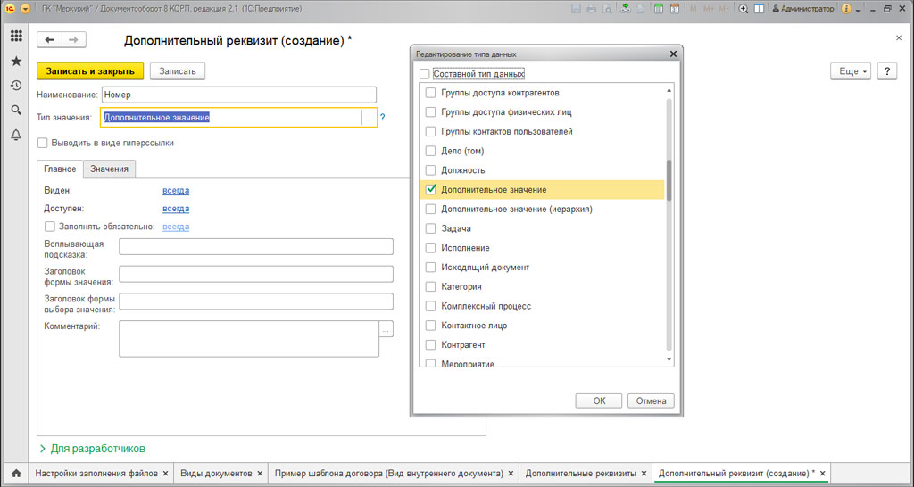 Если создать новый реквизит, то вам потребуется указать наименование и задать тип значения. Для этого пишем "Дополнительное значение", и задаем список на закладке "Значение".