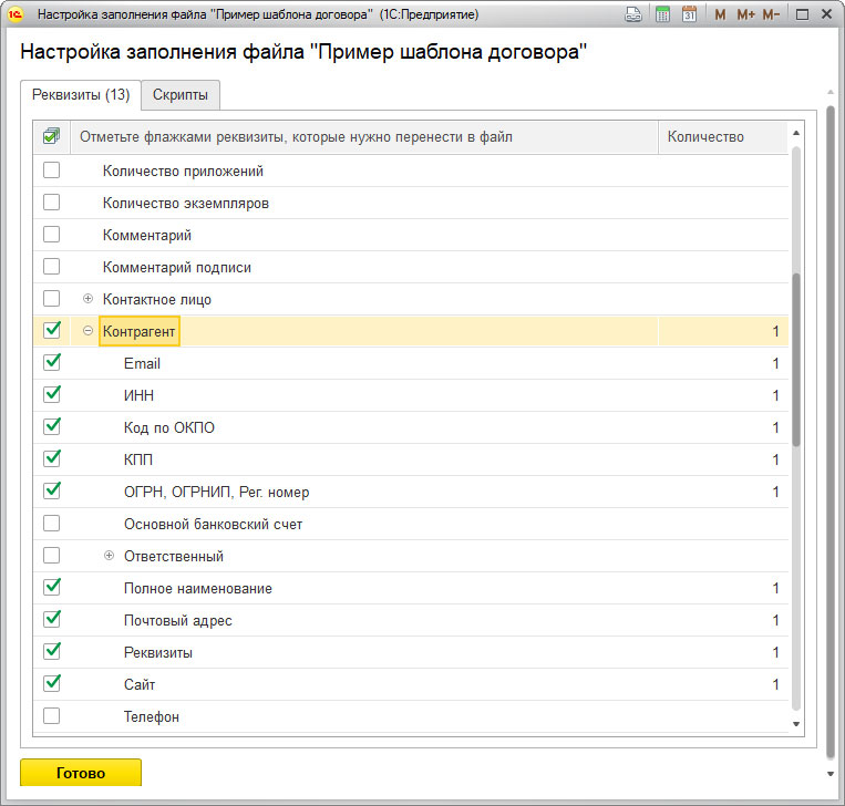 В открывшемся окне, мы отметим галочками реквизиты в необходимом количестве. После чего, мы сможем использовать их в тексте. Для этого нажимаем на "Копировать", "Вставить".