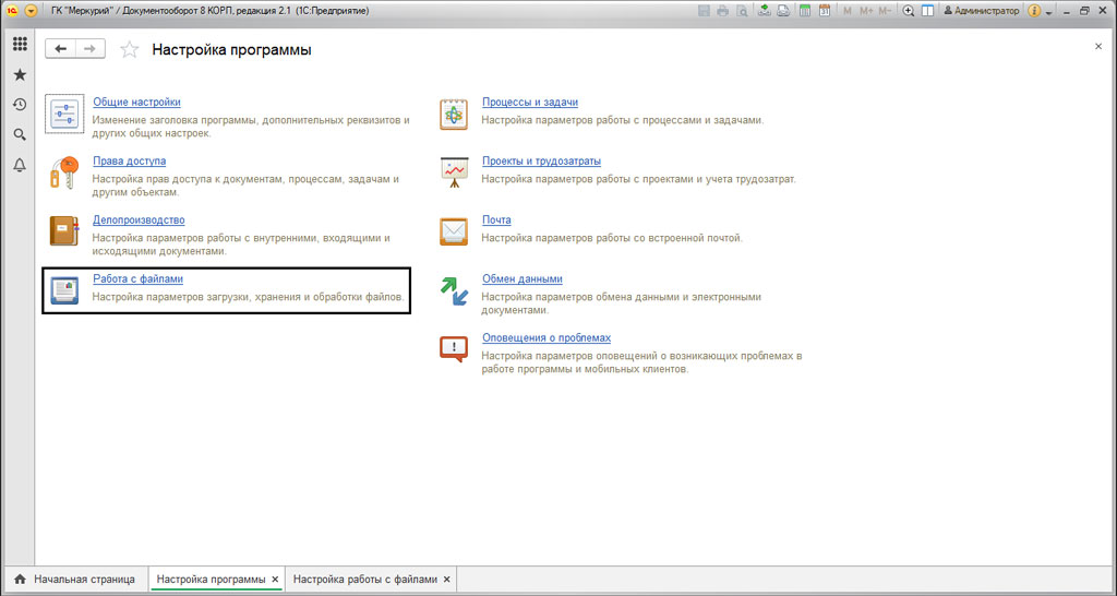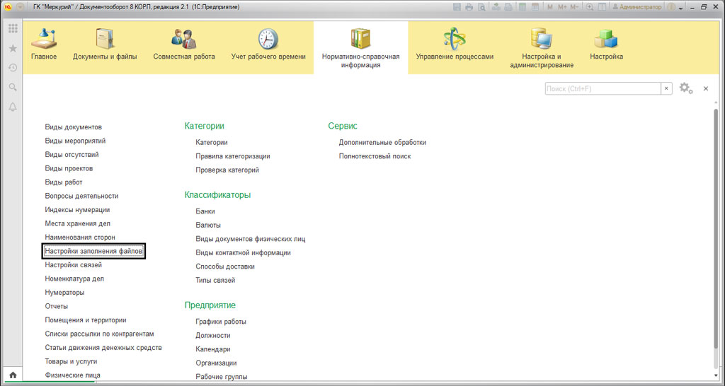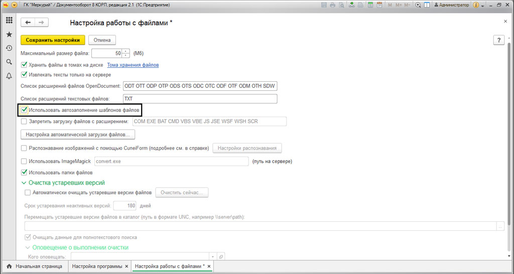 Что бы программа смогла работать с автозаполняемыми шаблонами, ее нужно настроить. Для этого, нужно перейти в "Настройки и администрирование"-"Настройка программы"-"Работа с файлами".