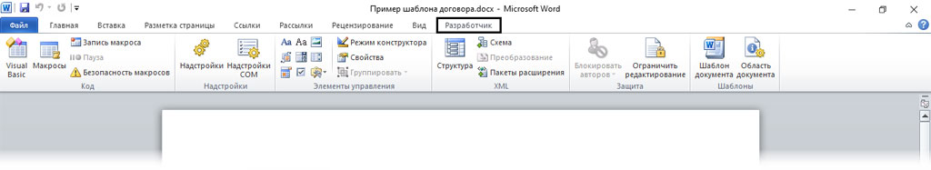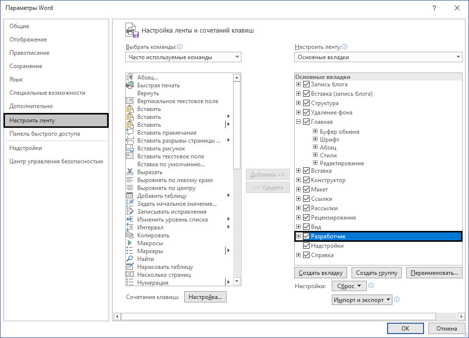 Для этого нужно включить режим "Разработчика". Если использовать MS WORD-10, то сделать это можно в меню "Параметры", дальше перейдем в раздел "Настроить ленту" и устанавливаем галочку на "Разработчик".