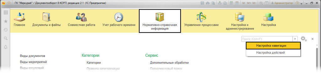 Для последующей настройки нам нужно перейти в раздел "Нормативно-справочная информация". В настройках выбираем "Настройка навигации". После чего выводим на рабочий стол меню, которого нет на рабочем столе.