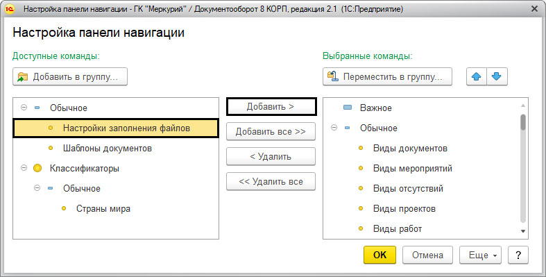 После этого, переносим кнопкой "Добавить" пункт "Настройки заполнения файлов" в правую часть "Выбранные команды".