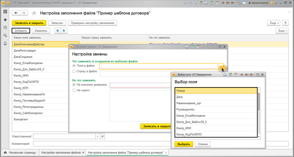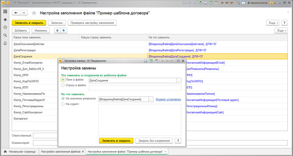 Дальше вводим нужные параметры замены. Реквизиты могут задаваться в виде выражений на встроенном языке, или к примеру в виде скрипта.