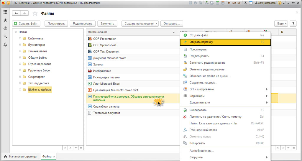 Для открытия файла, нам потребуется щелкнуть по нем правой кнопкой мышки, и нажать "Открыть карточку".