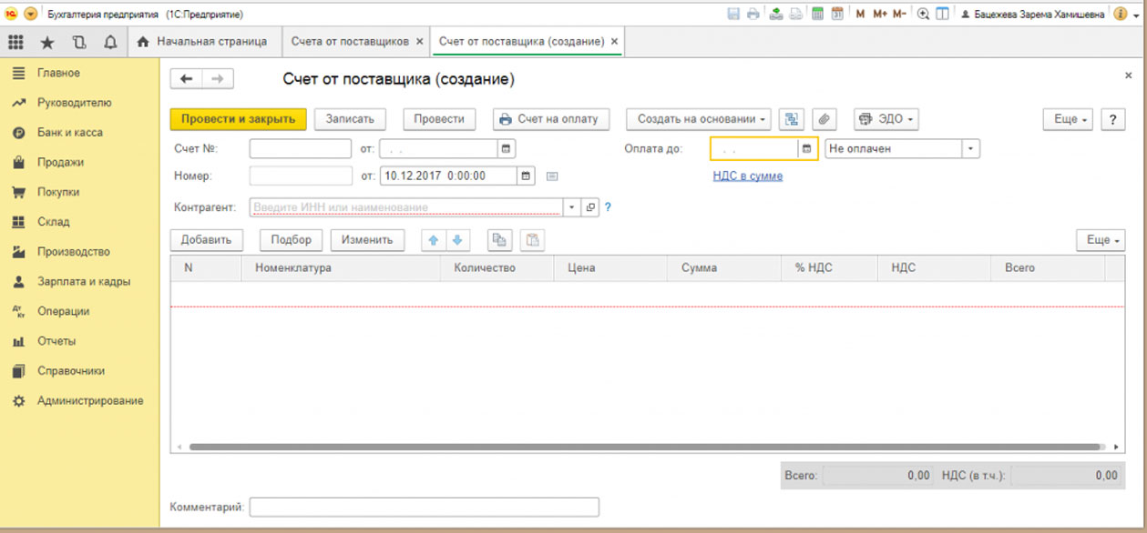 Для начала проведения учета производства в 1С потребуется определить смету расходов. Отдел закупок заключает договора на приобретение материалов для производства. В 1С можно зарегистрировать все заключенные договора, внести данные по счет-фактурам и счетам, привязанные конкретным договорам с поставщиками. Это выполняется в разделе «Покупки», где выбирается вкладка «Счет-фактуры полученные» либо «Счет от поставщика».