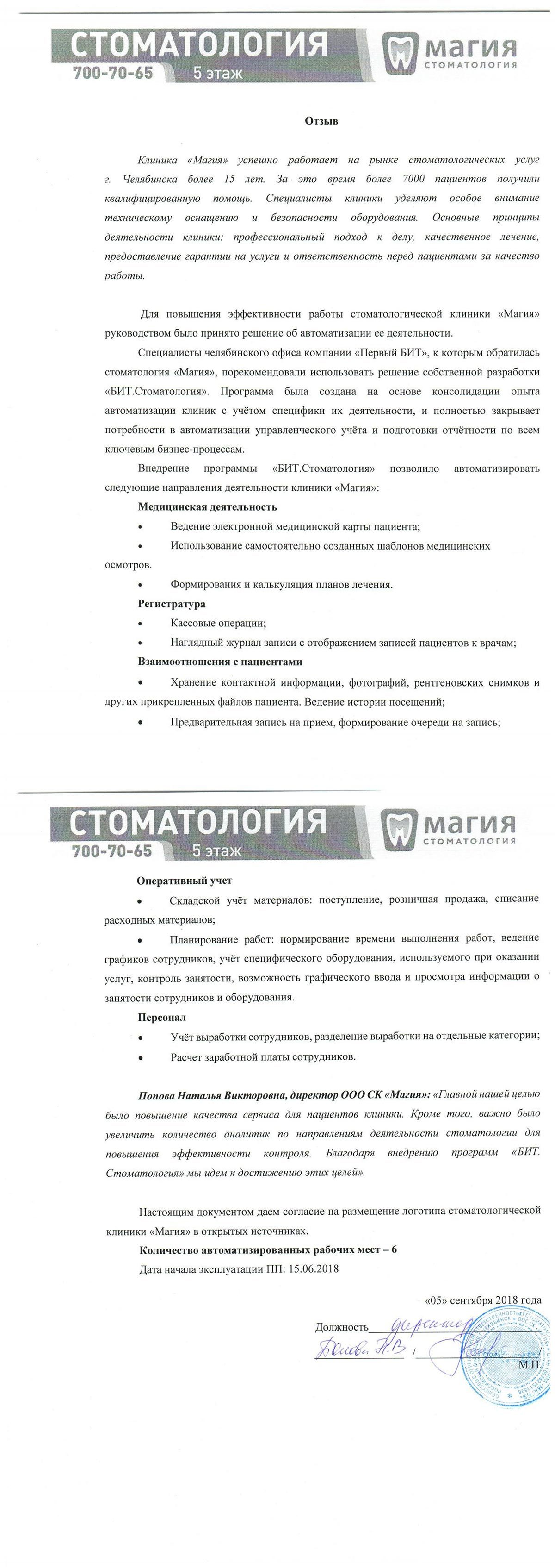 Клиника «Магия» успешно работает на рынке стоматологических услуг г. Челябинска более 15 лет. За это время более 7000 пациентов получили квалифицированную помощь. Специалисты клиники уделяют особое внимание техническому оснащению и безопасности оборудования. Основные принципы деятельности клиники: профессиональный подход к делу, качественное лечение, предоставление гарантии на услуги и ответственность перед пациентами за качество работы.